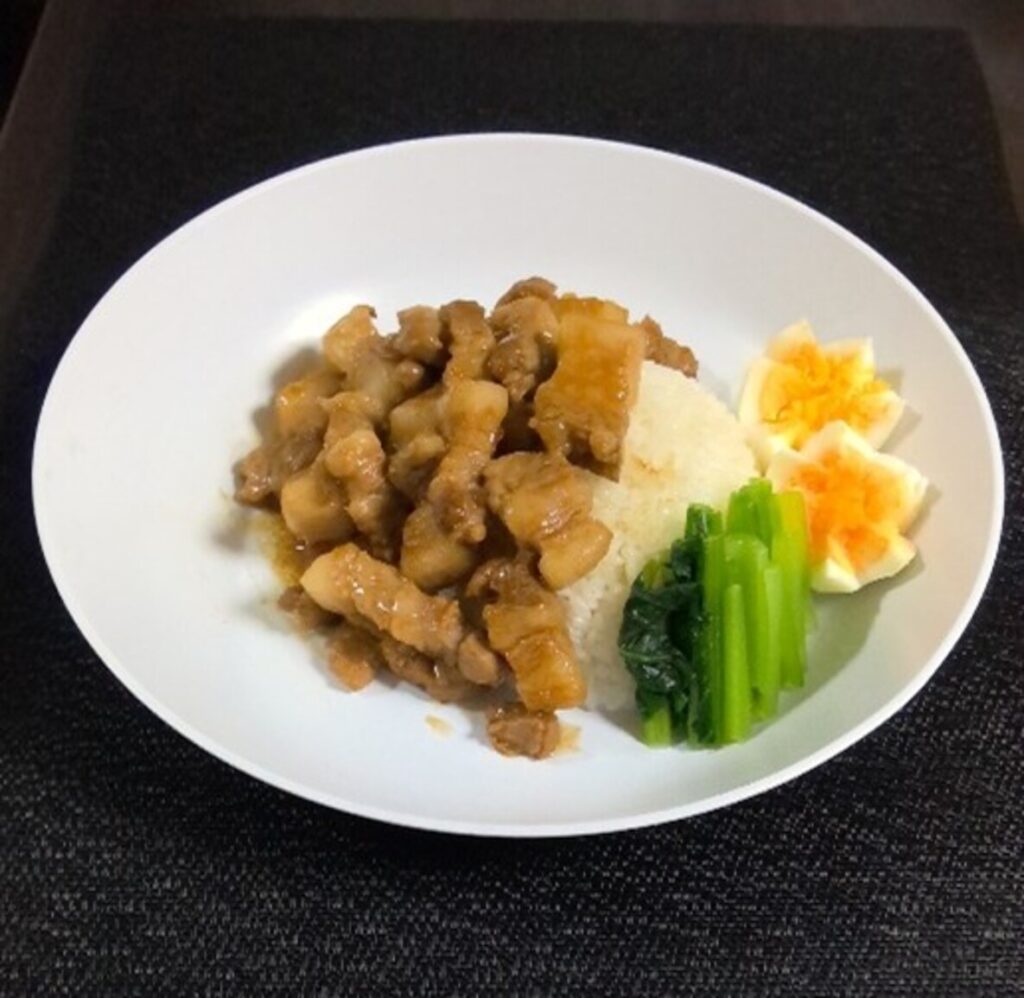 7.器に白飯を盛り、5をかけ、半分に切ったゆで卵、小松菜をのせる